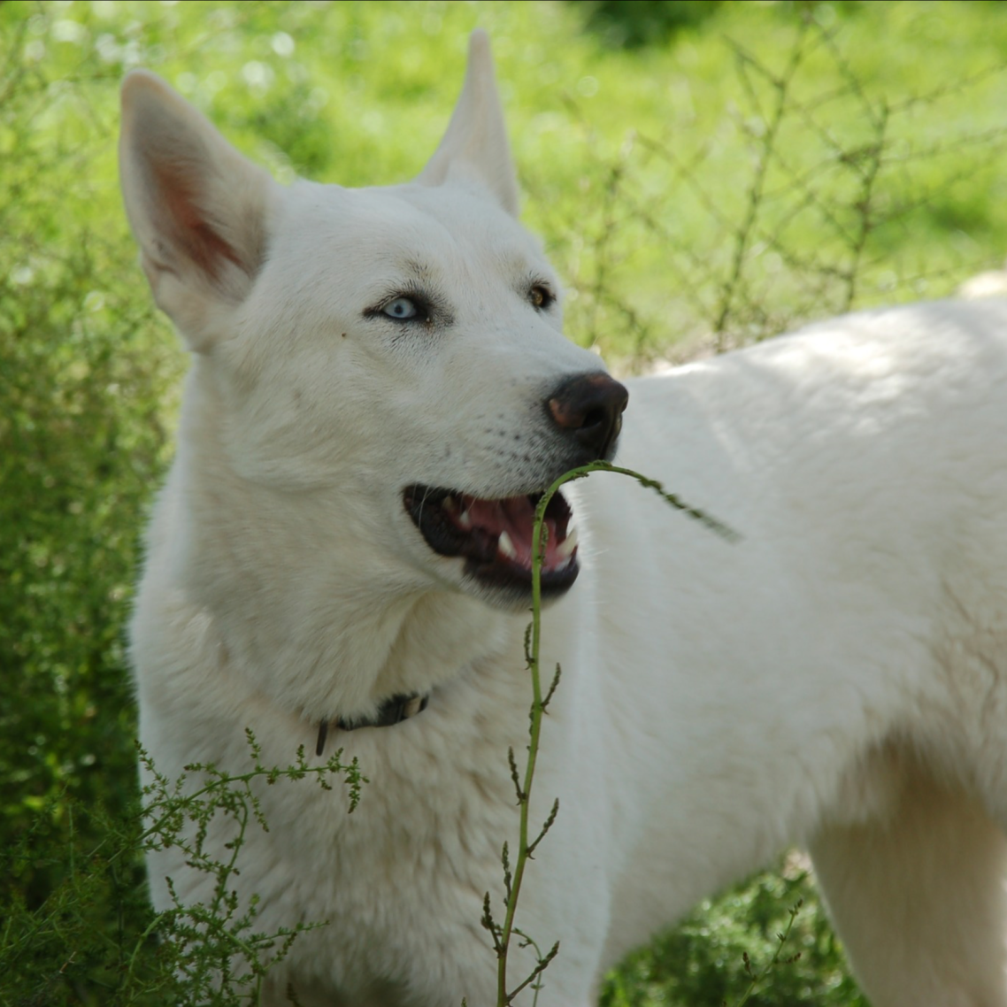 SHEPSKY (2. Generation. Großeltern Husky und Berger Blanc Suisse) Intakter Rüde, geb. 3.3.2022. Augen bicolor, Fell Stockhaar reinweis